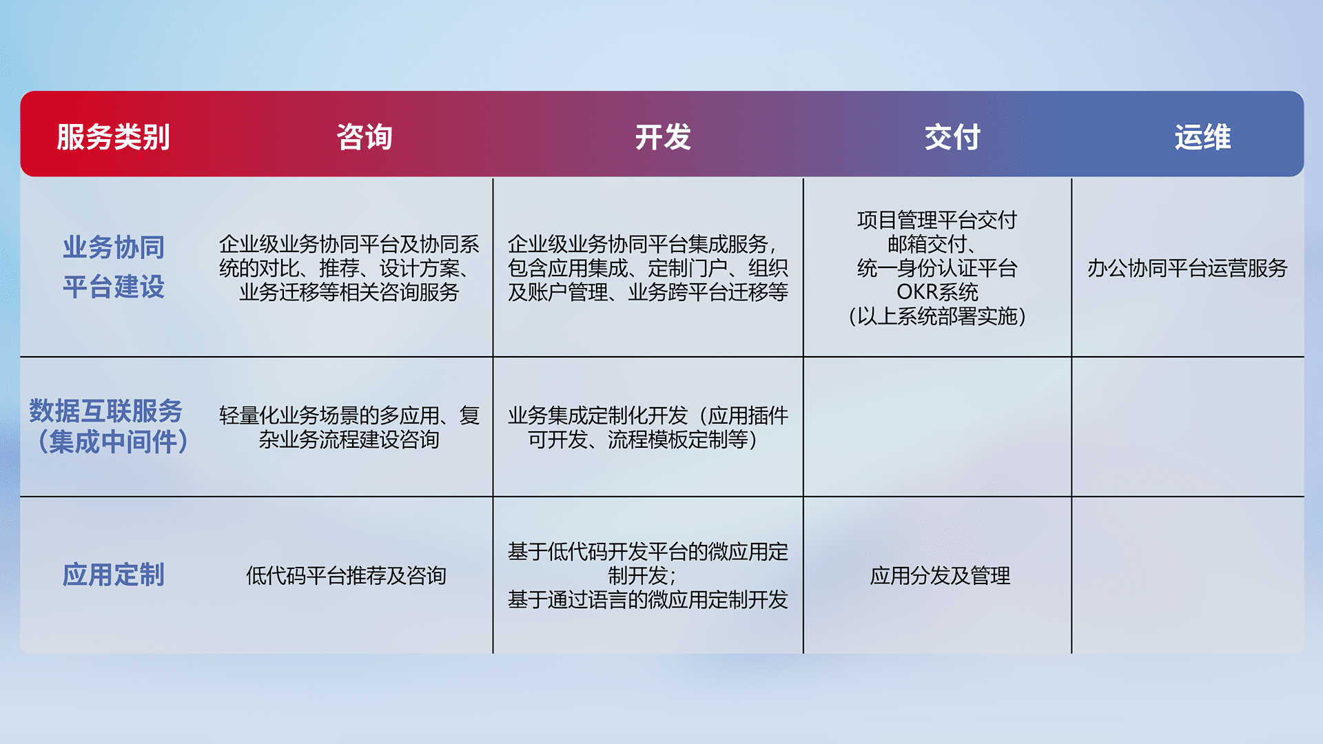 针对钉钉、、、企微、、IDaas等平台级产品提供产品的规划、、方案、、交付、、、、定制化开发等服务,,,实现如统一协同办公、、、、智能客户服务、、、、混合会议管理、、、、智能数据查询、、、等业务场景,,,,实现数字化转型。。